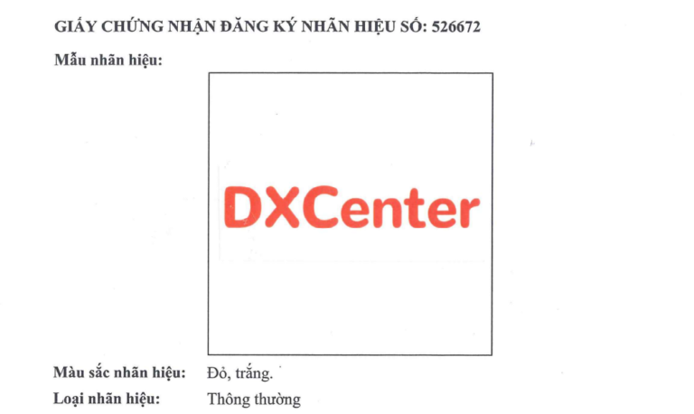 Trung tâm DXCenter đã chính thức được cấp Giấy chứng nhận đăng ký nhãn hiệu do Cục Sở hữu trí tuệ – Bộ Khoa học và Công nghệ cấp – Giấy chứng nhận đăng ký nhãn hiệu số 526672.